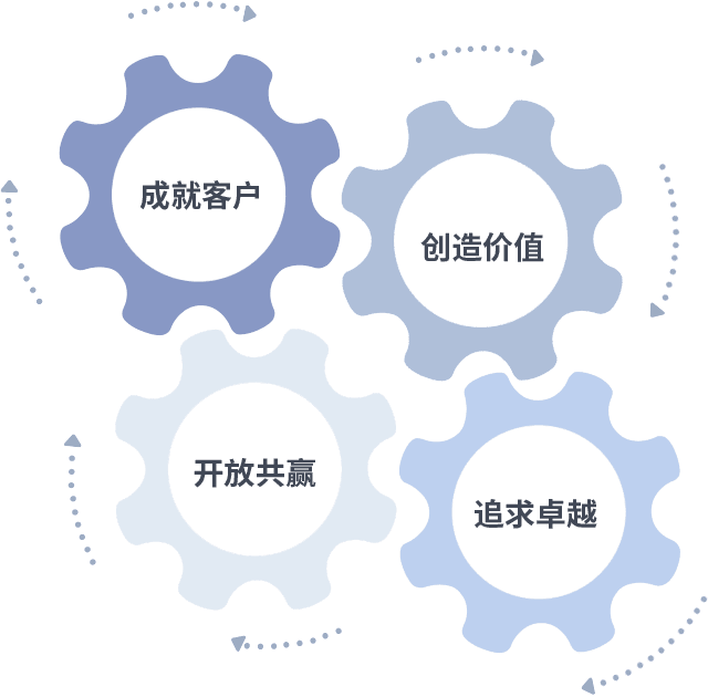 成就客户是一切决策的出发点,,,创造价值是衡量所有工作的标准,,追求卓越是我们做事做人的态度,,开放共赢是我们的格局也是最终的结果。。价值观的齿轮环环相扣,,,,推动着组织里的每个人不断向前。。。