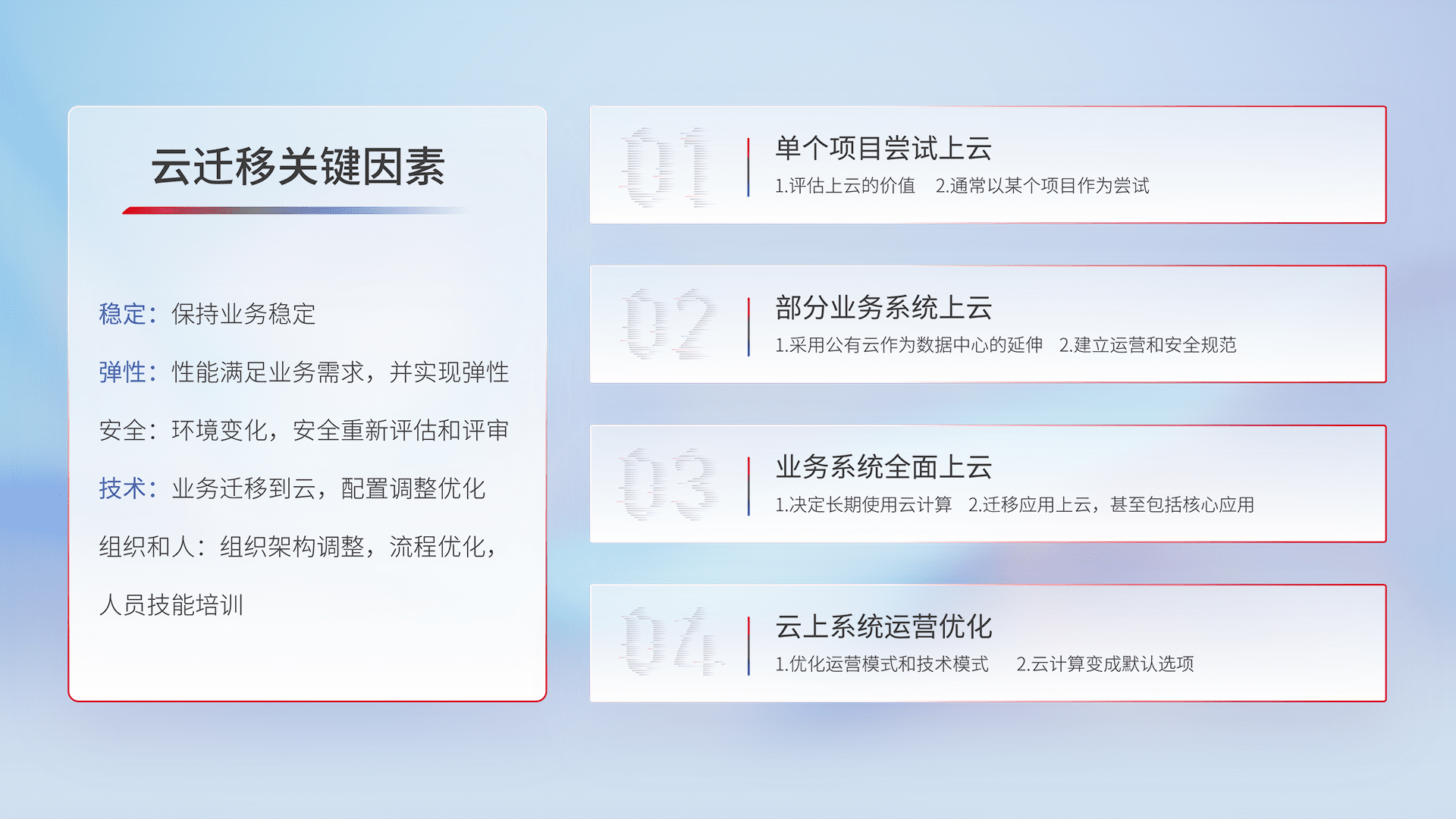 结合实际业务,,,,从规划设计、、、、云平台选型、、、、云原生改造、、、数据迁移、、、集成交付,,迁移全过程为客户识别最佳上云路径,,做好风险识别管理,,设计网络架构、、、身份权限、、、安全审计合规、、、操作审计、、日志审计、、、监控告警策略、、、多站点容灾设计等,,,对云上基础设施进行整体规划,,,提升IT治理水平,,以满足弹性、、、高可用、、、、高性能的需求。。